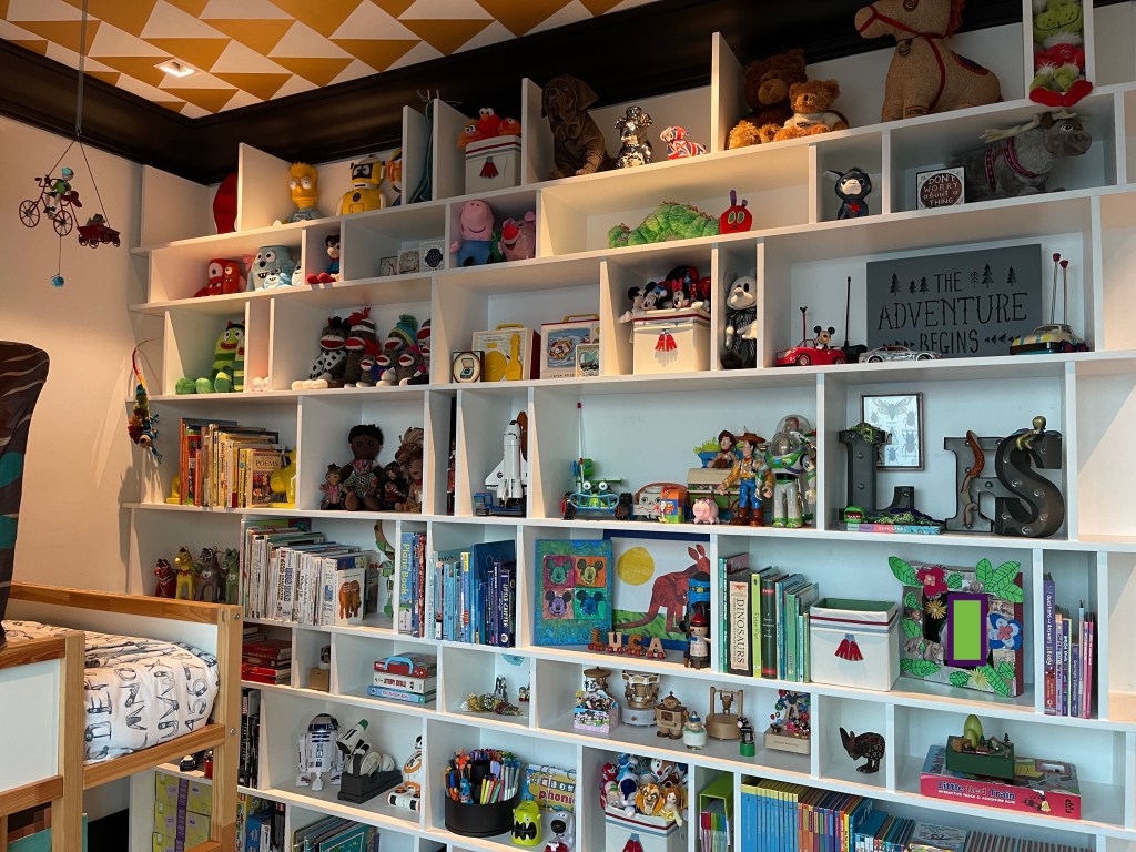 A lot of sorting happened to organize this bookshelf, but for me, it was more of connecting stories. What kind of story does a collection of cars tell? I clustered them with the sign that said, “The adventure begins,” and suddenly, the cars told an inspiring story.