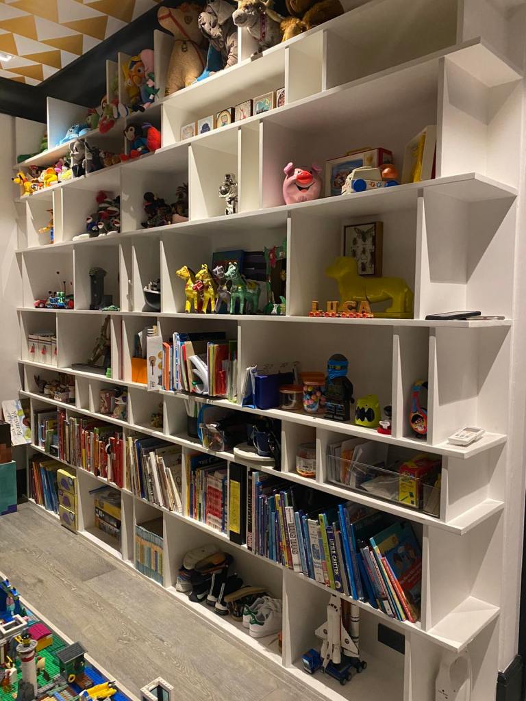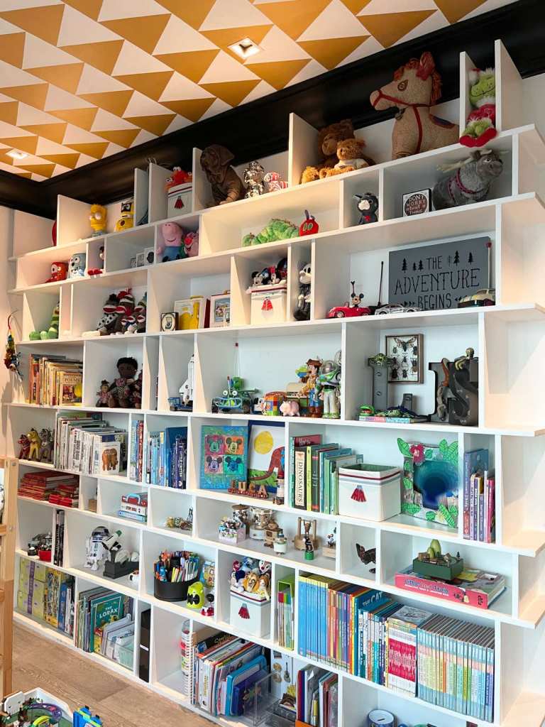 There are many ways to do it, but I chose to do it by connecting to its owner. I first asked his mom what his favorite color is. His mom said green, so I made sure there were shelves dedicated to highlight the color.
