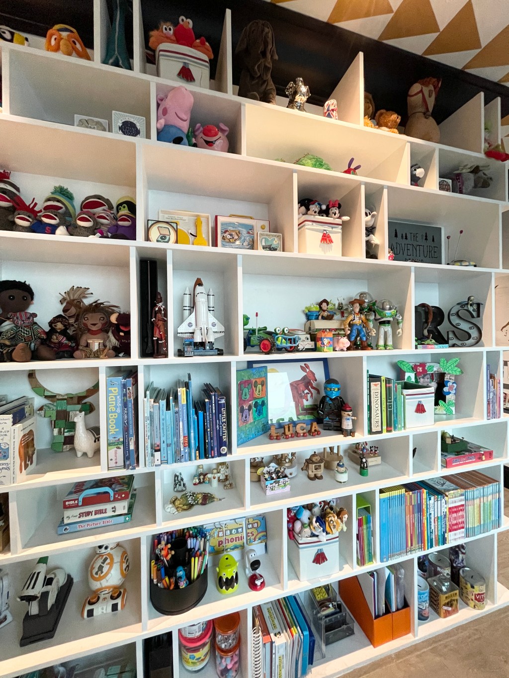 A lot of sorting happened to organize this bookshelf, but for me, it was more of connecting stories. What kind of story does a collection of cars tell? I clustered them with the sign that said, “The adventure begins,” and suddenly, the cars told an inspiring story.